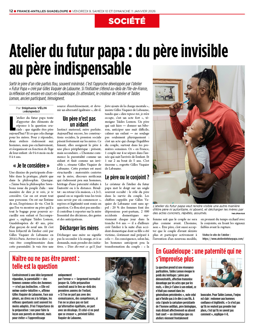 Formation Paternité Publication : 27 janvier 2026 Écrit par Gilles La formation futur papa est en vogue même jusqu'aux antilles En Guadeloupe on parle de ces nouveaux papas qui s'impliquent avec un certain savoir-faire indéniable Bravo les papas vous assurez Gilles Vaquier de labaume C.E.O. Atelier du futur papa JE RESERVE ICI MAINTENANT Catégorie : Actualité de l'atelier du futur papa